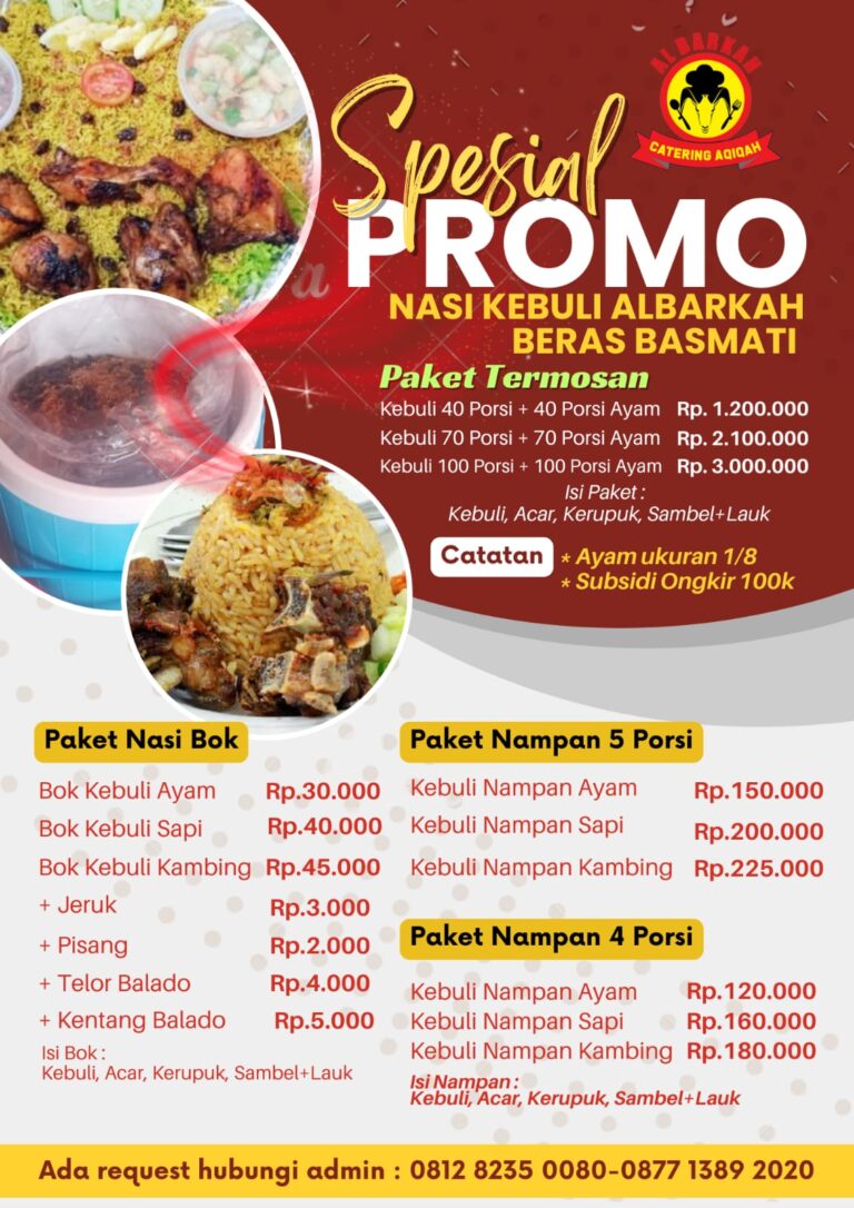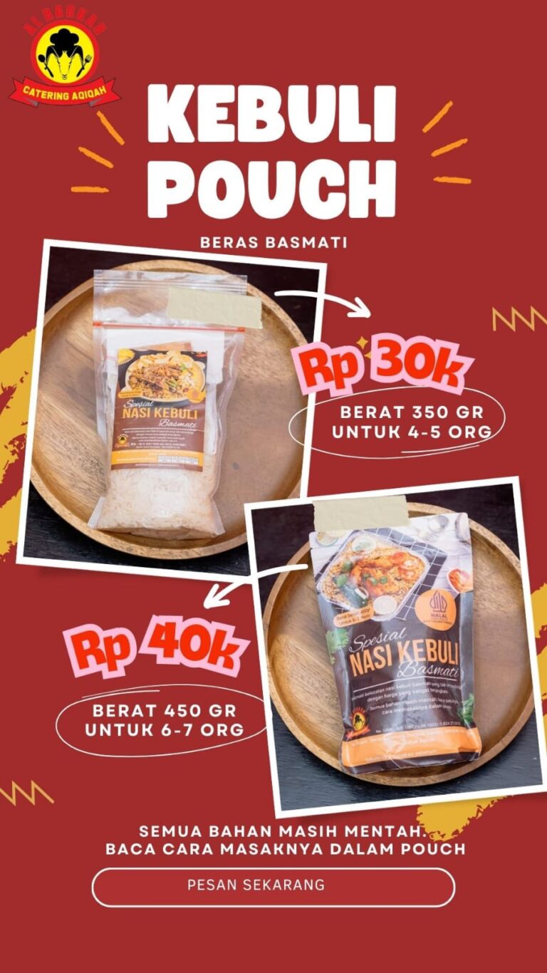 Selamat datang di Catering Nasi Kebuli Albarkah. Solusi terbaik hidangan Timur Tengah yang autentik, lezat dan berkualitas. Dengan pengalaman 15 Tahun, kami menghadirkan nasi kebuli istimewa yang dimasak dengan bumbu rempah pilihan, susu, minyak samin dan kaldu kambing dengan memakai bahan premium seperti beras basmati import dan beras lokal.